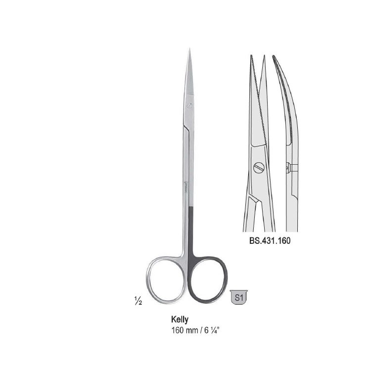 Scissors Kelly cur. 160mm one blade serrated